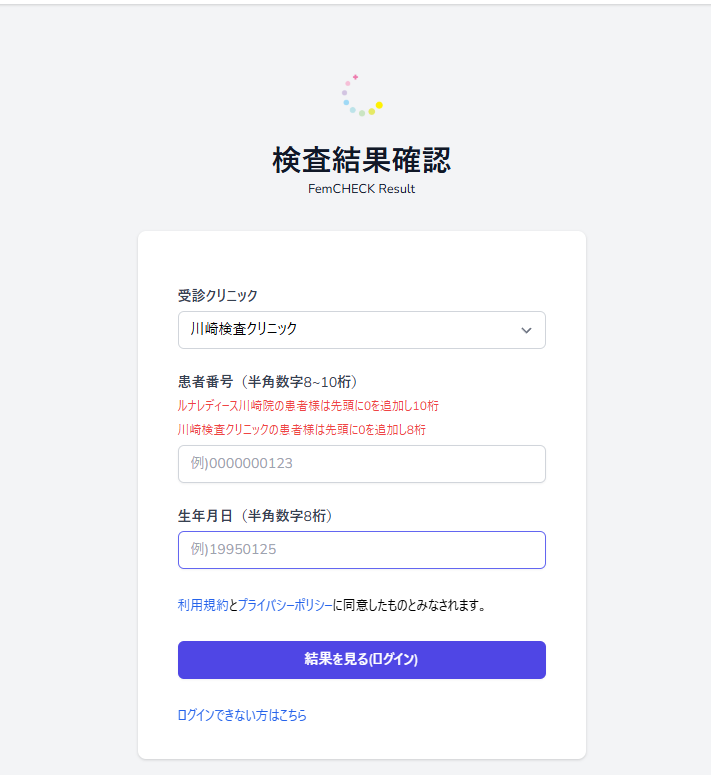 8桁の患者番号と生年月日をご入力の上、結果のご確認をお願いします。